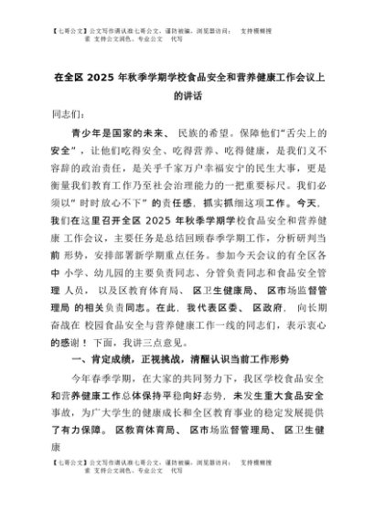 【七哥公文】2025年:在全区2025年秋季学期学校食品安全和营养健康工作会议上的讲话+更多免费公文+VX:QiGeGongWen2024