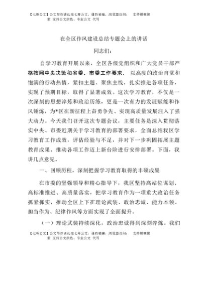/ 【七哥公文】2025年:在全区作风建设总结专题会上的讲话+更多免费公文+VX:QiGeGongWen2024