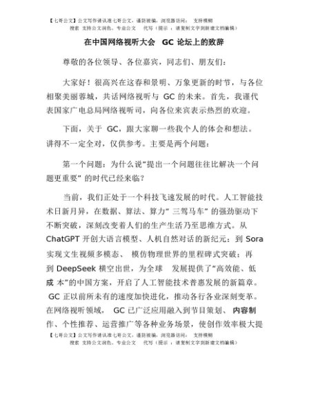 / 【七哥公文】2025年:在中国网络视听大会AIGC论坛上的致辞+更多免费公文+VX:QiGeGongWen2024