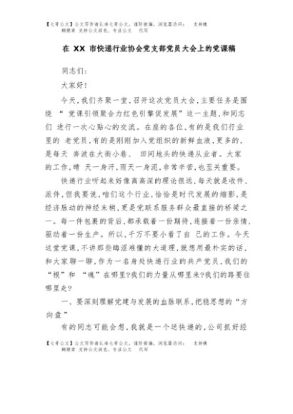 / 【七哥公文】2025年:在XX市快递行业协会党支部党员大会上的党课稿+更多免费公文+VX:QiGeGongWen2024