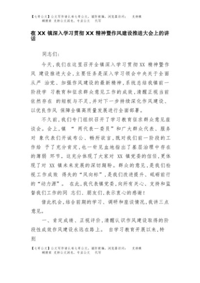 【七哥公文】2025年:在XX镇深入学习贯彻XX精神暨作风建设推进大会上的讲话+更多免费公文+VX:QiGeGongWen2024
