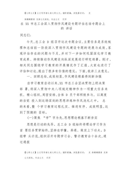 【七哥公文】2025年:在XX市总工会深入贯彻作风建设专题评估总结专题会上的讲话+更多免费公文+VX:QiGeGongWen2024