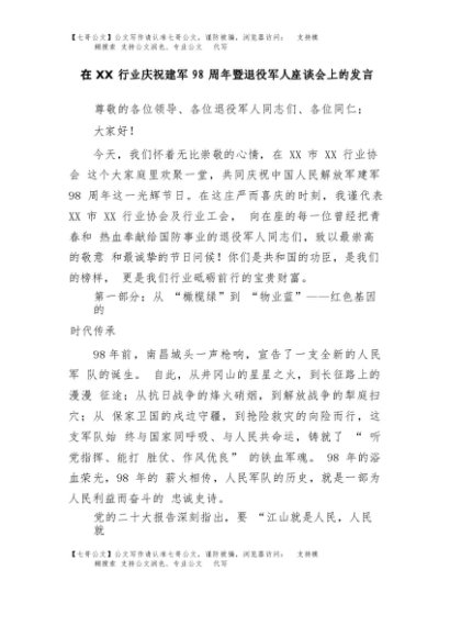 【七哥公文】2025年:在XX行业庆祝建军98周年暨退役军人座谈会上的发言+更多免费公文+VX:QiGeGongWen2024