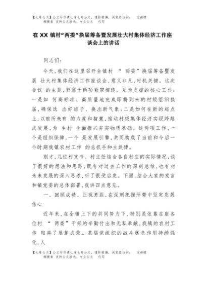 【七哥公文】2025年:在XX镇村“两委”换届筹备暨发展壮大村集体经济工作座谈会上的讲话+更多免费公文+VX:QiGeGongWen2024