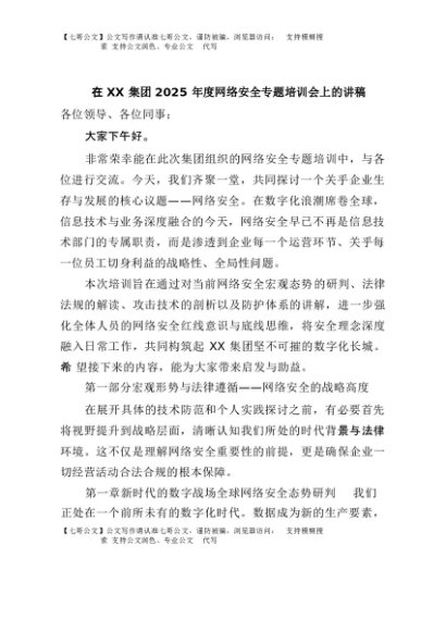 【七哥公文】2025年:在XX集团2025年度网络安全专题培训会上的讲稿+更多免费公文+VX:QiGeGongWen2024