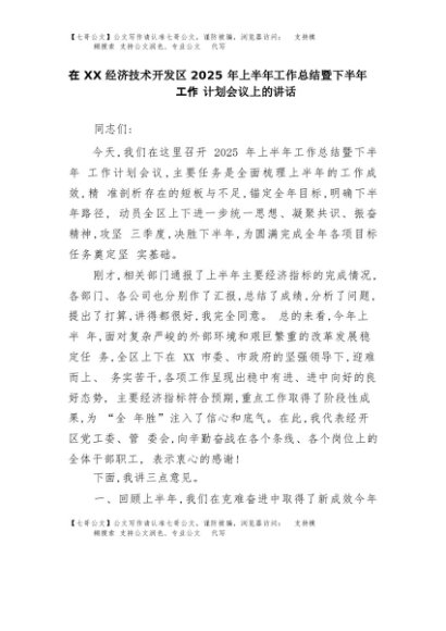 【七哥公文】2025年:在XX经济技术开发区2025年上半年工作总结暨下半年工作计划会议上的讲话+更多免费公文+VX:QiGeGongWen2024