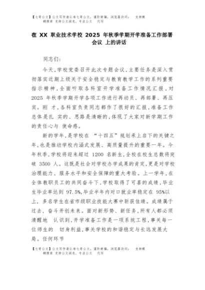 【七哥公文】2025年:在XX职业技术学校2025年秋季学期开学准备工作部署会议上的讲话+更多免费公文+VX:QiGeGongWen2024