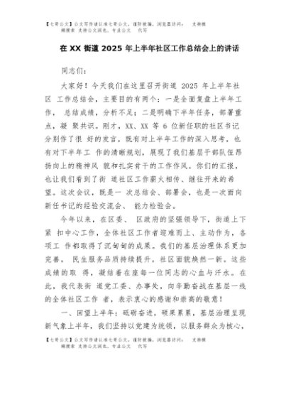 【七哥公文】2025年:在XX街道2025年上半年社区工作总结会上的讲话+更多免费公文+VX:QiGeGongWen2024