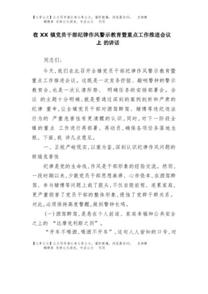 【七哥公文】2025年:在XX镇党员干部纪律作风警示教育暨重点工作推进会议上的讲话+更多免费公文+VX:QiGeGongWen2024