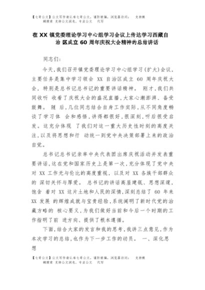 【七哥公文】2025年:在XX镇党委理论学习中心组学习会议上传达学习西藏自治区成立60周年庆祝大会精神的总结讲话+更多免费公文+VX:QiGeGongWen2024