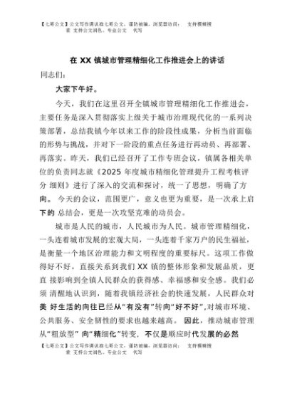 / 【七哥公文】2025年:在XX镇城市管理精细化工作推进会上的讲话+更多免费公文+VX:QiGeGongWen2024