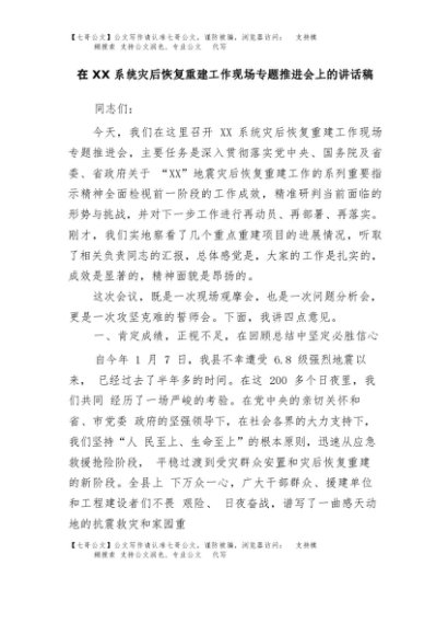 【七哥公文】2025年:在XX系统灾后恢复重建工作现场专题推进会上的讲话稿+更多免费公文+VX:QiGeGongWen2024