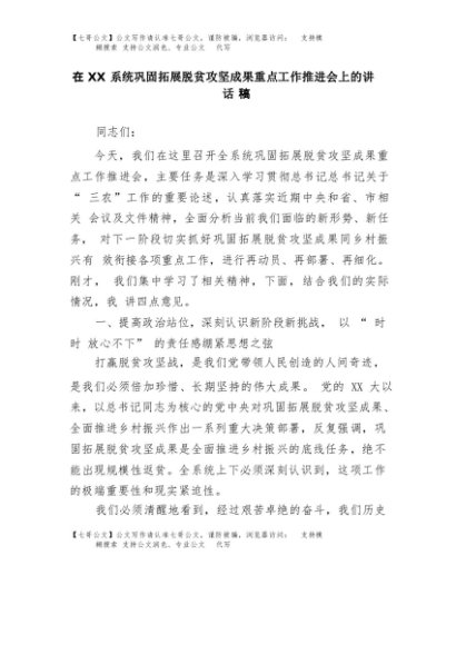 【七哥公文】2025年:在XX系统巩固拓展脱贫攻坚成果重点工作推进会上的讲话稿+更多免费公文+VX:QiGeGongWen2024