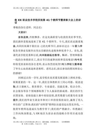 【七哥公文】2025年:在XX职业技术学校庆祝第41个教师节暨表彰大会上的讲话+更多免费公文+VX:QiGeGongWen2024