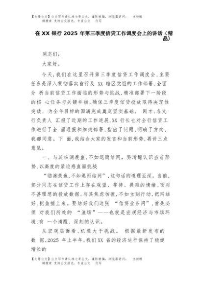 【七哥公文】2025年:在XX银行2025年第三季度信贷工作调度会上的讲话(精品)+更多免费公文+VX:QiGeGongWen2024