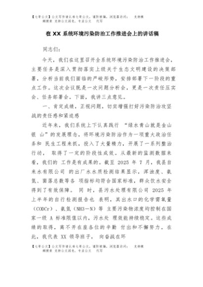 / 【七哥公文】2025年:在XX系统环境污染防治工作推进会上的讲话稿+更多免费公文+VX:QiGeGongWen2024