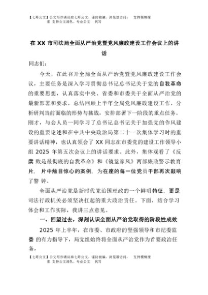【七哥公文】2025年:在XX市司法局全面从严治党暨党风廉政建设工作会议上的讲话+更多免费公文+VX:QiGeGongWen2024