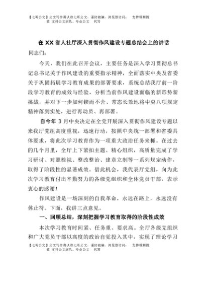 【七哥公文】2025年:在XX省人社厅深入贯彻作风建设专题总结会上的讲话+更多免费公文+VX:QiGeGongWen2024