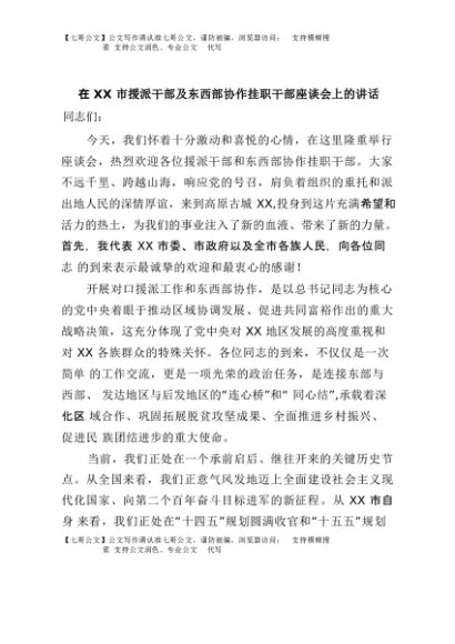 【七哥公文】2025年:在XX市援派干部及东西部协作挂职干部座谈会上的讲话+更多免费公文+VX:QiGeGongWen2024