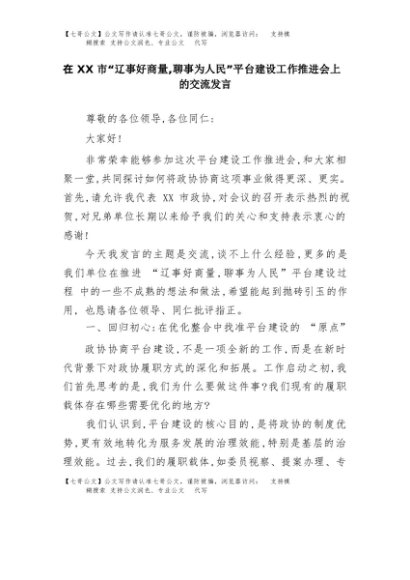 【七哥公文】2025年:在XX市“辽事好商量,聊事为人民”平台建设工作推进会上的交流发言+更多免费公文+VX:QiGeGongWen2024