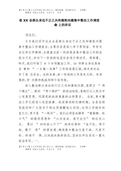 【七哥公文】2025年:在XX县群众身边不正之风和腐败问题集中整治工作调度会上的讲话+更多免费公文+VX:QiGeGongWen2024