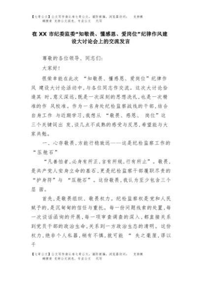 【七哥公文】2025年:在XX市纪委监委“知敬畏、懂感恩、爱岗位”纪律作风建设大讨论会上的交流发言+更多免费公文+VX:QiGeGongWen2024
