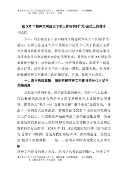 【七哥公文】2025年:在XX市精神文明建设专项工作机制(扩大)会议上的讲话+更多免费公文+VX:QiGeGongWen2024