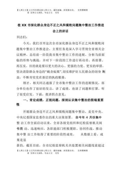 【七哥公文】2025年:在XX市深化群众身边不正之风和腐败问题集中整治工作推进会上的讲话+更多免费公文+VX:QiGeGongWen2024