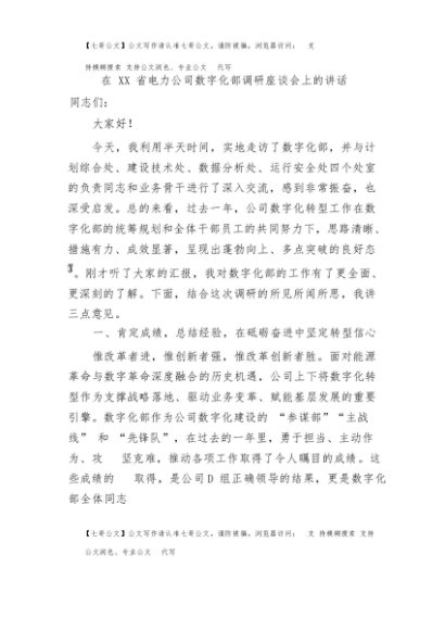 / 【七哥公文】2025年:在XX省电力公司数字化部调研座谈会上的讲话+更多免费公文+VX:QiGeGongWen2024