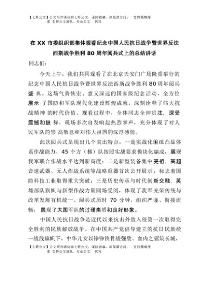 【七哥公文】2025年:在XX市委组织部集体观看纪念中国人民抗日战争暨世界反法西斯战争胜利80周年阅兵式上的总结讲话+更多免费公文+VX:QiGeGongWen2024
