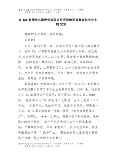 【七哥公文】2025年:在XX智能继电器股份有限公司庆祝建军节暨表彰大会上的发言+更多免费公文+VX:QiGeGongWen2024