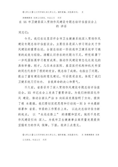 【七哥公文】2025年:在XX市卫健委深入贯彻作风建设专题总结评估座谈会上的讲话+更多免费公文+VX:QiGeGongWen2024