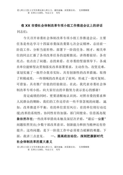 【七哥公文】2025年:在XX市委社会体制改革专项小组工作推进会议上的讲话+更多免费公文+VX:QiGeGongWen2024