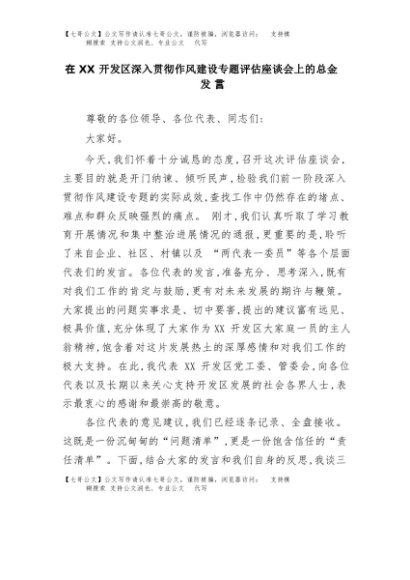【七哥公文】2025年:在XX开发区深入贯彻作风建设专题评估座谈会上的总金发言+更多免费公文+VX:QiGeGongWen2024