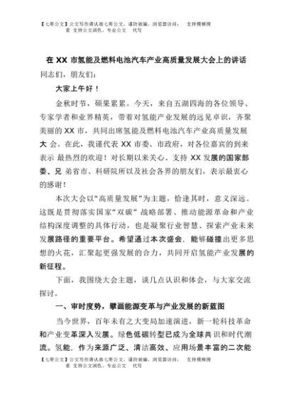 【七哥公文】2025年:在XX市氢能及燃料电池汽车产业高质量发展大会上的讲话+更多免费公文+VX:QiGeGongWen2024