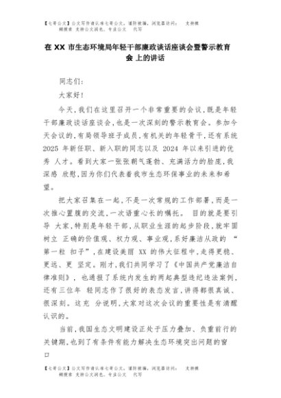 【七哥公文】2025年:在XX市生态环境局年轻干部廉政谈话座谈会暨警示教育会上的讲话+更多免费公文+VX:QiGeGongWen2024