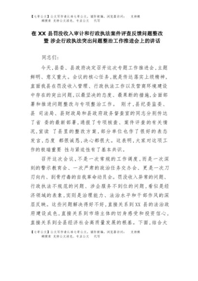 【七哥公文】2025年:在XX县罚没收入审计和行政执法案件评查反馈问题整改暨涉企行政执法突出问题整治工作推进会上的讲话+更多免费公文+VX:QiGeGongWen2024