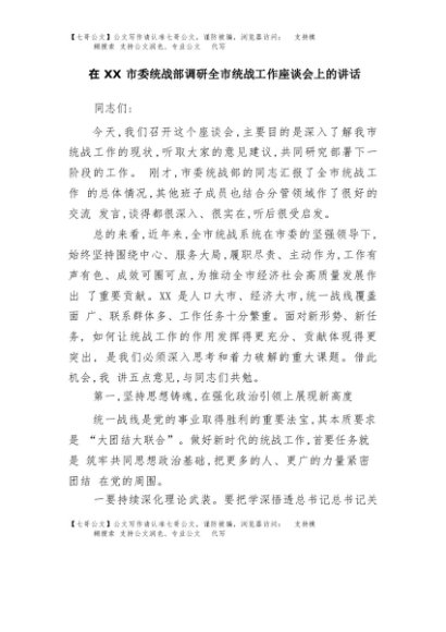 / 【七哥公文】2025年:在XX市委统战部调研全市统战工作座谈会上的讲话+更多免费公文+VX:QiGeGongWen2024
