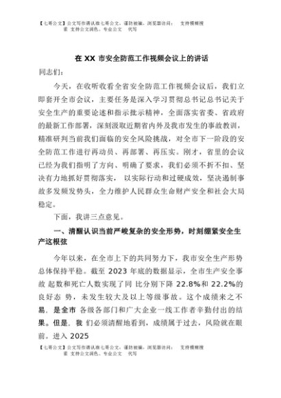 / 【七哥公文】2025年:在XX市安全防范工作视频会议上的讲话+更多免费公文+VX:QiGeGongWen2024