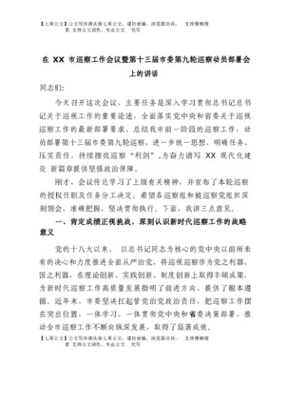 【七哥公文】2025年:在XX市巡察工作会议暨第十三届市委第九轮巡察动员部署会上的讲话+更多免费公文+VX:QiGeGongWen2024