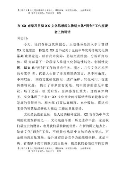【七哥公文】2025年:在XX市学习贯彻XX文化思想深入推进文化“两创”工作座谈会上的讲话+更多免费公文+VX:QiGeGongWen2024