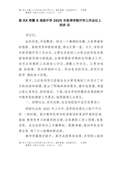 【七哥公文】2025年:在XX市第X高级中学2025年秋季学期开学工作会议上的讲话+更多免费公文+VX:QiGeGongWen2024