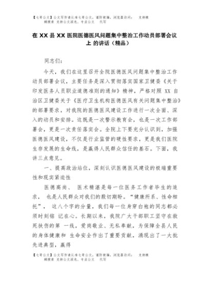 【七哥公文】2025年:在XX县XX医院医德医风问题集中整治工作动员部署会议上的讲话(精品)+更多免费公文+VX:QiGeGongWen2024