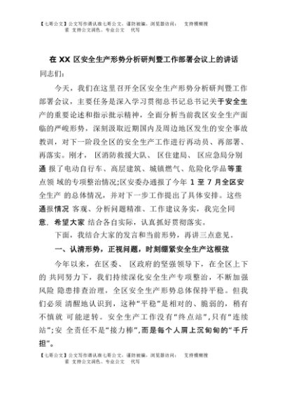 【七哥公文】2025年:在XX区安全生产形势分析研判暨工作部署会议上的讲话+更多免费公文+VX:QiGeGongWen2024