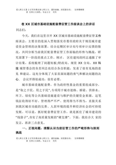 【七哥公文】2025年:在XX区城市基础设施配套费征管工作座谈会上的讲话+更多免费公文+VX:QiGeGongWen2024