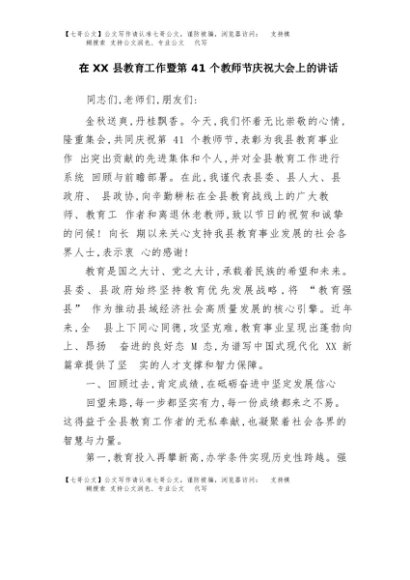 【七哥公文】2025年:在XX县教育工作暨第41个教师节庆祝大会上的讲话+更多免费公文+VX:QiGeGongWen2024