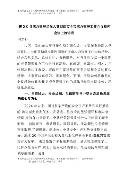 【七哥公文】2025年:在XX县应急管理局深入贯彻落实全市应急管理工作会议精神会议上的讲话+更多免费公文+VX:QiGeGongWen2024