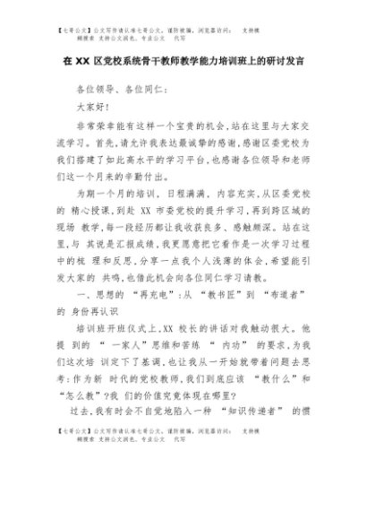 【七哥公文】2025年:在XX区党校系统骨干教师教学能力培训班上的研讨发言+更多免费公文+VX:QiGeGongWen2024
