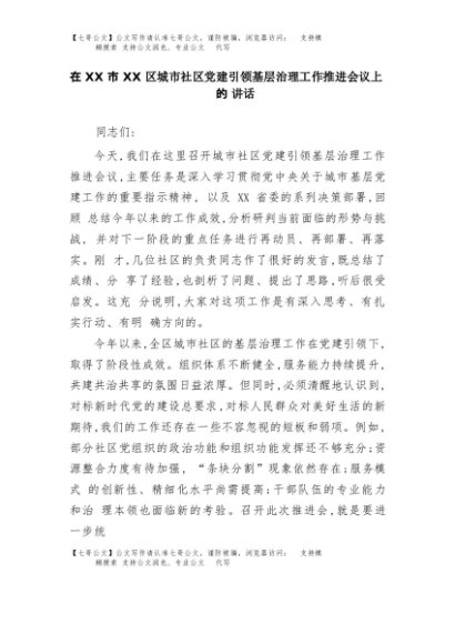 【七哥公文】2025年:在XX市XX区城市社区党建引领基层治理工作推进会议上的讲话+更多免费公文+VX:QiGeGongWen2024