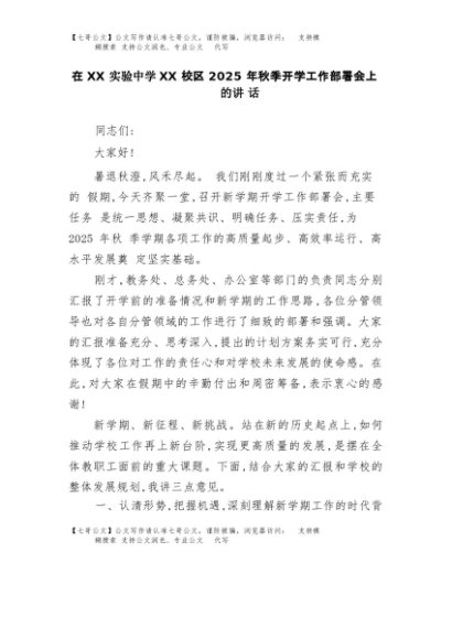 【七哥公文】2025年:在XX实验中学XX校区2025年秋季开学工作部署会上的讲话+更多免费公文+VX:QiGeGongWen2024
